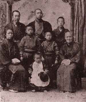 明治34年春写した写真。 自分(最前列中央)は満1年七ヶ月だったと思う。父(後列向かって左)は金沢税務署監督局(今の国税局にあたる)の関税課長という地位にあった。 父の右(後列中央)は長兄、その右(後列右)は次兄である。中央は向かって左から母、三兄、四兄そして向って右端の頭を丸めたのは祖母でこの人は33才位で祖父と死別、父と叔母を育て、再婚をせぬ決意をもって自ら頭を丸めたもので意志の強い人であった。 今では兄弟二人だけが残り、他の兄弟は若くして他界した。こうしてみていると想い出多い写真である。 昭和40年2月、当時社長の松本六郎翁が社内報「まつかぜ」に写真とともに寄稿されたものです。 |